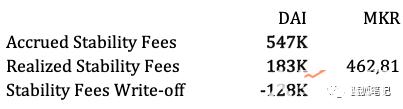 区分应计费用和实收费用很重要。因为2018年只实现了稳定费用的一部分。另外,SCD有一个很少人知道的特征:当CDP被清算时,MakerDAO放弃了应计费用。这导致一些应计稳定费用的销除(预计将来的多边抵押DAI将取消这些消除)。
